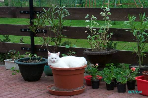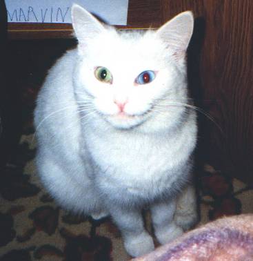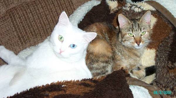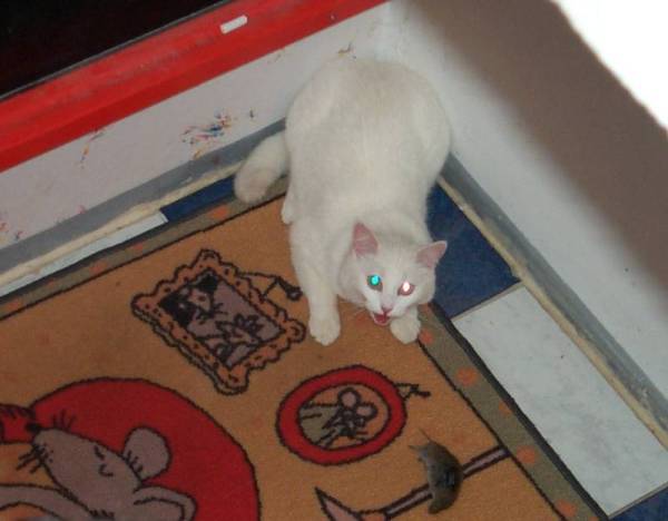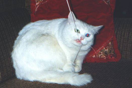 Sie hat sich bei uns prima eingelebt und ist die beste Mäusefängerin. Kennzeichnend für diese Rasse ist das weisse Fell und die unterschiedlich gefärbten Augen.